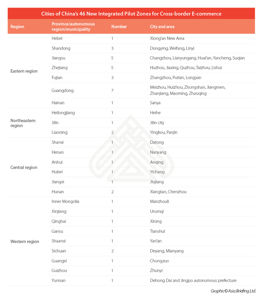 Hasta ahora, China ha aprobado el establecimiento de zonas de comercio electrónico transfronterizo en cinco fases y agrupando varias ciudades en cada fase. Mientras que las primeras zonas CBEC se concentran mayoritariamente en las grandes y medianas ciudades del este del país (Pekín, Shanghái, Cantón, y provincias de Zhejiang, Jiangsu, Shandong y Fujian), progresivamente se han ido incorporando estas zonas también en las capitales de provincias, y ciudades de segundo y tercer nivel.